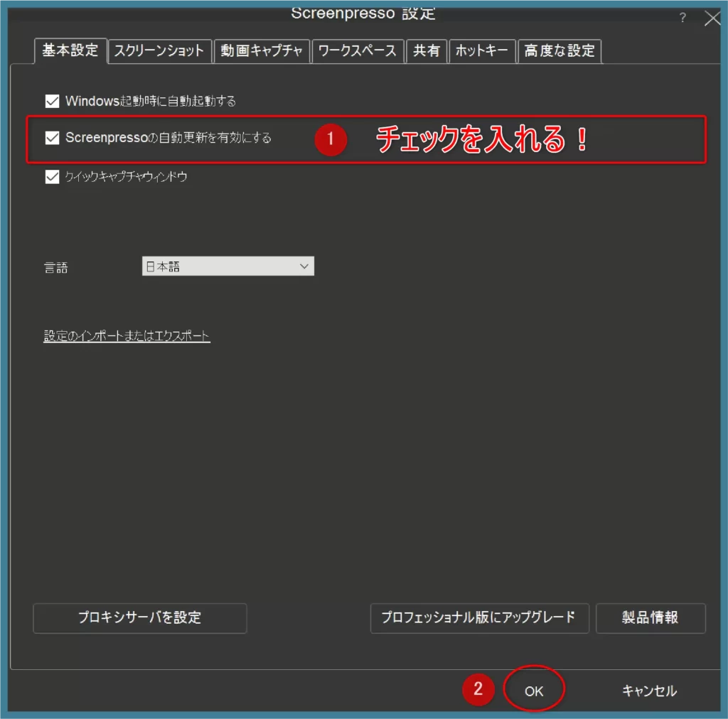 『Screenpresso』の設定を開き、「クイックキャプチャウィンドウの表示設定」と「画面キャプチャタイミングを遅らせて起動」の2つの設定を行うことをお勧めします。