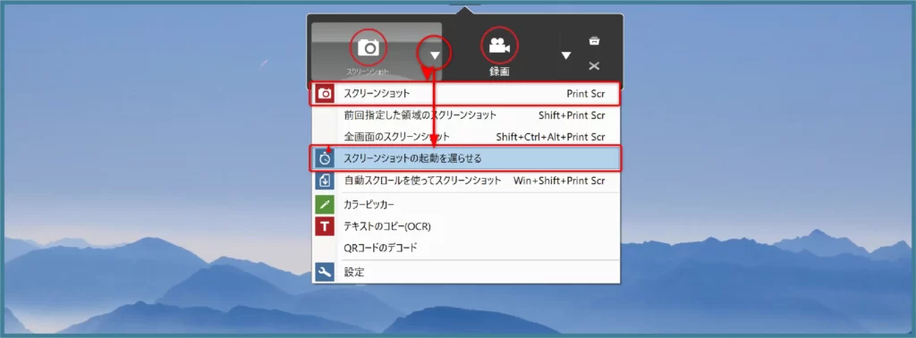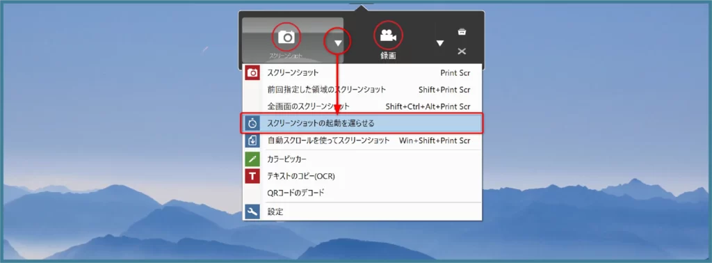 スクリーンショットを撮る際に起動を遅らせる場合、クイックキャプチャウィンドウの▼ボタンをクリックして、スクリーンショットの起動を遅らせることができます。