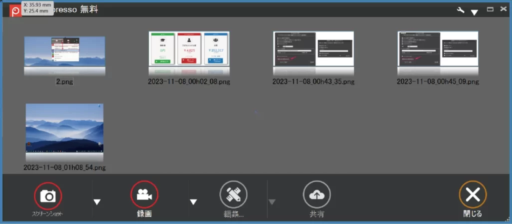 キャプチャーをすると、ここにキャプチャー画像が蓄積されていきますので、画像書庫のように考えて、ここから前にキャプチャーした画像を利用して加工したりする場合に便利です。