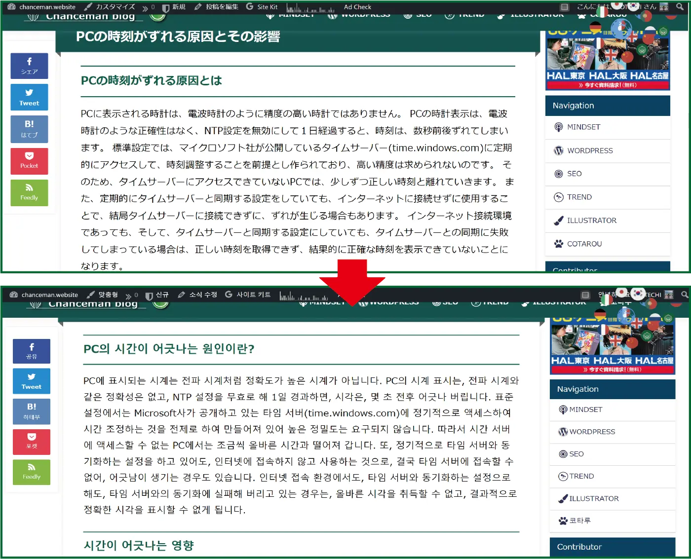 実際の投稿画面で、「韓国」アイコンを選択すると、日本語の記事がハングル文字へと瞬時に変換されます。