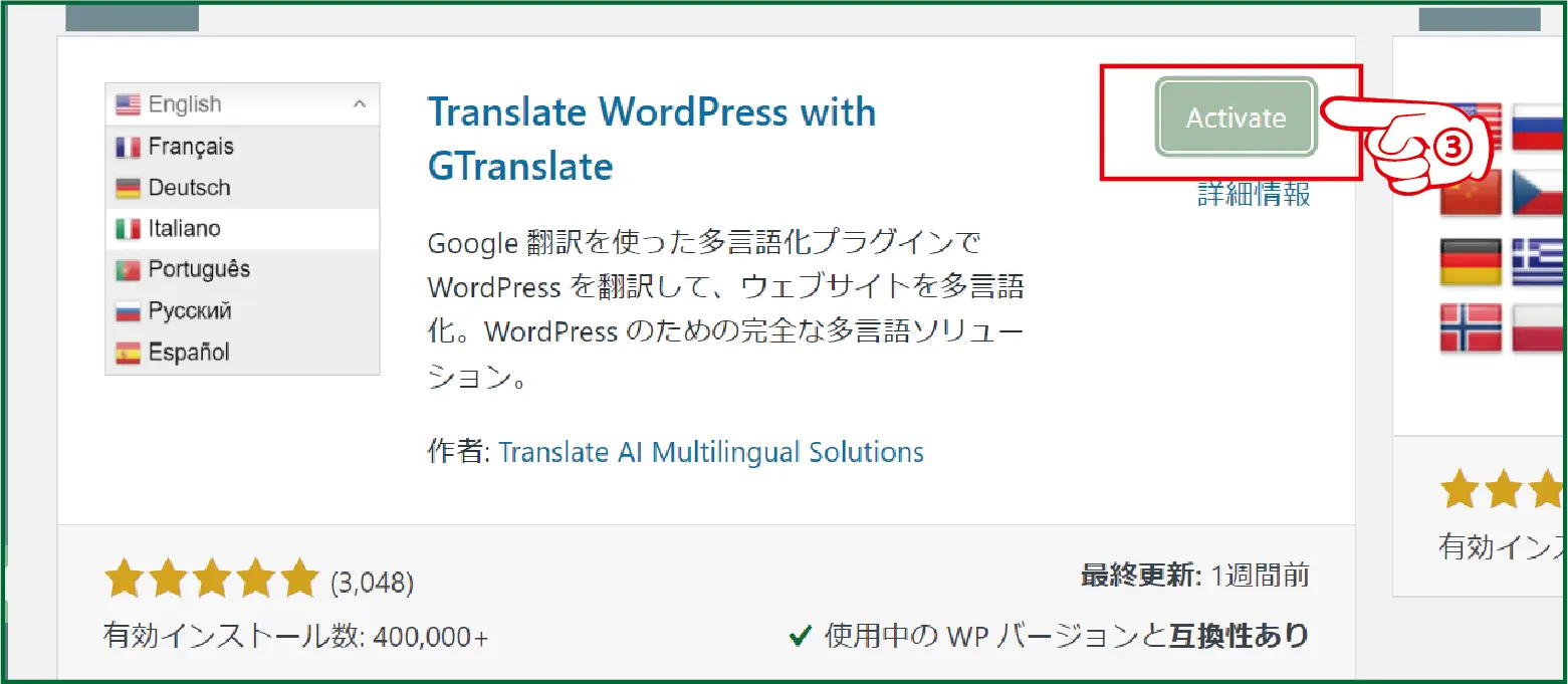 WordPress管理画面から「Translate WordPress with GTranslate」を検索してインストールします。①②