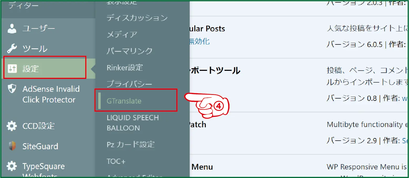 WordPress管理画面で「有効化」した後は、下記左下箇所で「GTranslate」をクリックして設定してきます。④