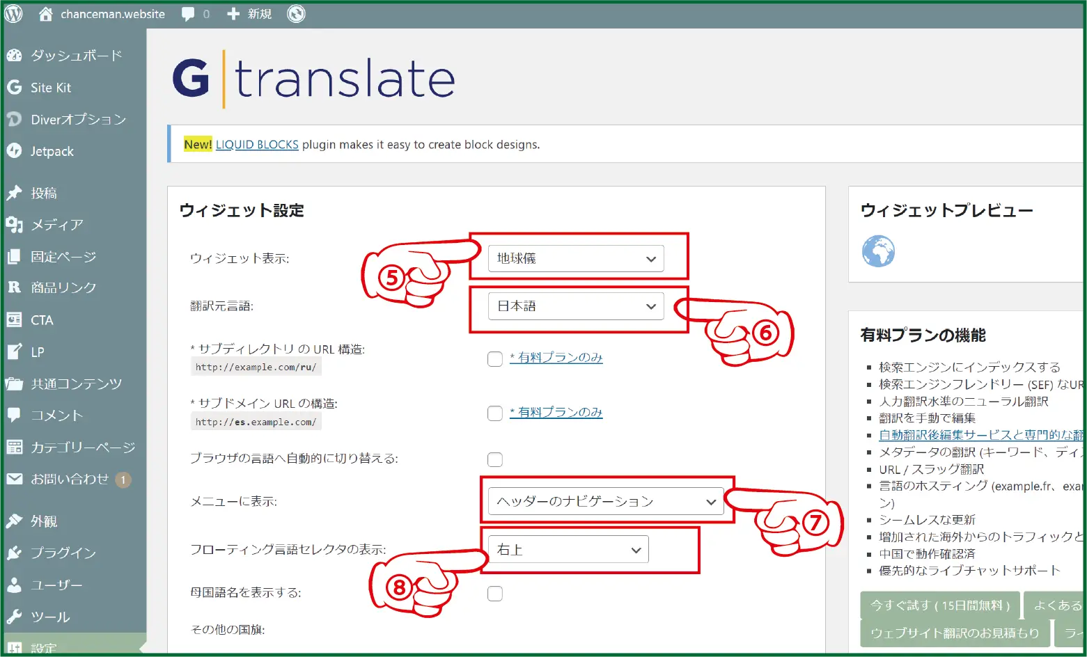 では、さっそく「Translate WordPress with GTranslate」をご自分のサイトに反映できるようWordPressに設定する流れを紹介していきましょう。