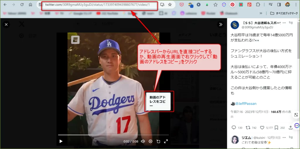 X(旧Twitter)上で保存したい動画のページを開いて、URLを直接コピーするか、動画の再生画面で右クリックして「動画のアドレスをコピー」を選択してください。